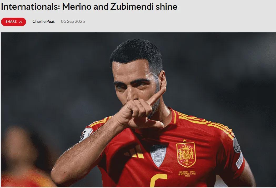 梅里诺首发踢满全场并打进1球,祖比门迪出战62分钟并贡献1个助攻,帮助西班牙在世预赛中3-0战胜了保加利亚。这个进球也是梅里诺代表西班牙打进的第5球。